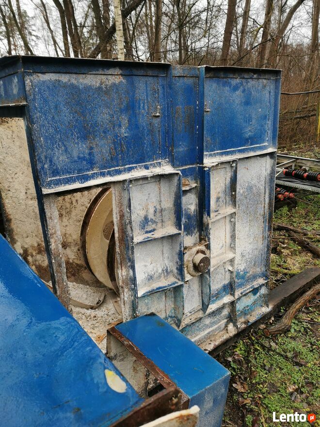 6. Obudowa górna 0 wysokości 2000mm osadzona na konstrukcji wsporczej z kołami napędowymi D=750mm, sprzęgło, przekładnia i=43 z kołem pasowym D=200mm, brak silnika.